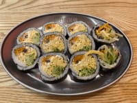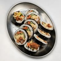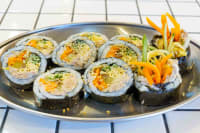 Rice rolls wrapped with seaweed, stuffed with Korean fried chicken, egg, fresh cucumber, cooked carrots, pickled radish and pickled burdock. (Halal, Contains: sesame, seafood, and egg)