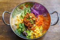 Rice bowls topped with leafy salad, cooked carrots, fresh cucumber, sweetcorn, egg and your choice of protein. (Halal, Contains: sesame, seafood, and egg)