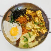 Fried rice with kimchi and tuna, topped with mozzarella cheese, sweetcorn, seaweed flakes, a sunny-side up fried egg, and your choice of protein. (Halal, Contains: sesame, seafood, and egg)