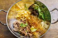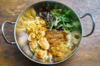 Topokki with chilli peppery sauce with Beef Bulgogi rice cakes, fishcakes and vegetables. (Halal, Contains: sesame, seafood, and egg)