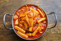 Topokki with chilli peppery sauce with rice cakes and vegetables. (Halal)