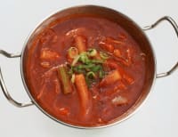 Topokki with chilli peppery sauce with rice cakes, fishcakes and vegetables. (Halal, Contains: sesame, seafood, and egg)