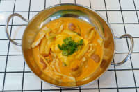Topokki with mildly and creamy chilli peppery sauce with pork sausage, rice cakes, fishcakes and vegetables, cheddar cheese on top. (Contains: sesame, seafood, and egg)