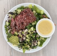 tuna sashimi. black rice. cucumber. spring onion. avocado. edamame. furikake. kale. slaw. salad mix. lemon vinaigrette dressing.
