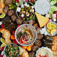 A selection of olives, dolmades, falafel, halloumi, bocconcini, lamb kofta, hummus, tahini, tabouleh, pita.