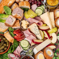 A selection of meats, cheeses, pate's preserves, pickles and specialty breads.