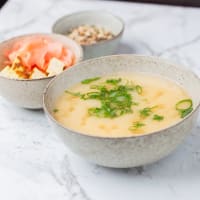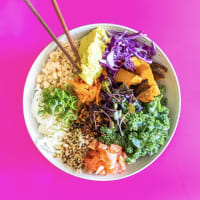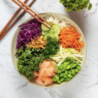 A Japanese inspired healthy bowl with rice and/ or slaw mix base, topped with kale, edamame, cucumber, pickled ginger, wakame, crunchy shallots and toasted sesame seed mix with a miso dressing. **Recommended protein: Teriyaki pork belly.