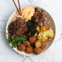 Brown rice with quinoa, roasted cauliflower, caramelised onion, kale, tahini sauce & curried lentilfalafel, topped with crispy kale & harissa hummus. **Bowl comes without protein. Recommended protein: Slow roast lamb.