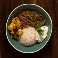 Fragrant lamb tagine, jasmine rice, roasted cauliflower, tzatziki, toasted seeds & spring onion.
