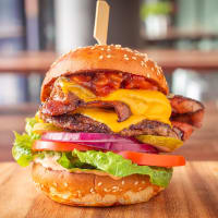 180g x Grass-fed patty, Grillaz burger sauce, BBQ sauce, caramelised onion, smokey bacon, burger cheese, cos lettuce & tomato, on a sesame bun.