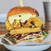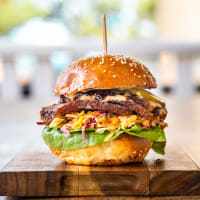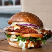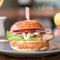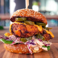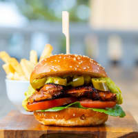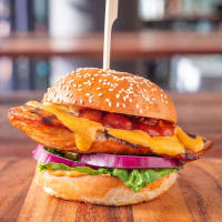 Free-range egg, crispy bacon, rocket, caramelised onion, house-made relish and bbq sauce on a lightly taosted sesame bun.