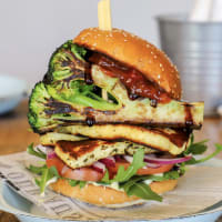 Roasted, Moroccan spiced pumpkin, grilled Halloumi, basil mayo, crunchy kale slaw, fresh basil and hummus on lightly charred country white sourdough bread.