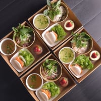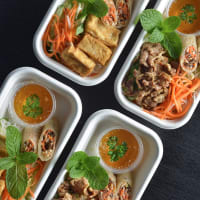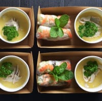 10 x Pho, Vietnamese noodle soup, 10 x Fresh rice paper rolls with lemongrass chicken and 10 x Vietnamese crispy spring rolls. * The minimum order is for 10 people, increments by 10. * If you have a different number, please order extra quantities from the Add-Ons menu