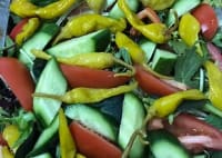 With mesclun lettuce, pickled peppers, Roma tomatoes, olives and home-made Italian salad dressing.