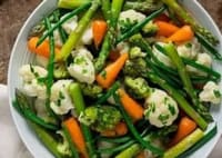 With broccoli, cauliflower, carrots, green beans, asparagus and olive oil and lemon dressing.