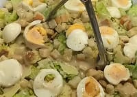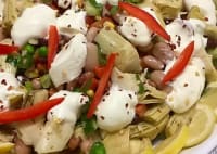With five beans, shallots, artichokes, sliced peppers, sour cream, chili Mexican dressing.