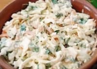 With pasta, baby cooked prawns, avocado capsicum, celery, capers, seafood stick pieces, whole egg mayo, tartare sauce.