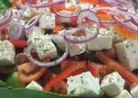With cubed crusty bread, baby rocket, extra virgin olive oil, ripe cherry tomatoes, cucumber, mozzarella cheese, red Onions, basil leaves, red wine vinegar.
