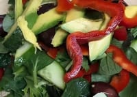 With mixed leaves, cucumber, avocado, capsicum, olives and Italian dressing.
