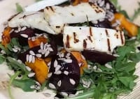 With baby beetroot, roasted pumpkin grilled haloumi, sunflower seeds, balsamic glaze.