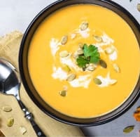 Pumpkin, butter, potato, onion, carrot, celery croutons and sour cream. Bread roll and butter portion.