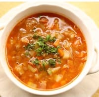Diced beef, carrot, celery, onion, potato, sort cut pasta, rich red tomato juice. Bread roll and butter portion.