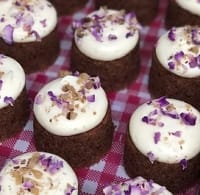 A mini deliciously delicate spiced carrot cake with a cream cheese icing and topped with walnuts and edible flowers.