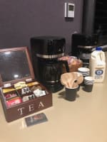 Freshly percolated coffee, Tea selection, bottled water, milk and biscuits.