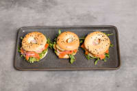 Mini bagel with avocado smash, aged goats cheddar, tomato, rocket & green goddess dressing. Delivered cold (Individual item)