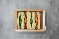 Selection of 20 mini assorted sandwiches with chef’s selection fillings: • Shaved ham, cheddar, tomato, seeded mustard mayo, chutney and mixed leaves • Roast chicken with baby spinach and truffled pecorino mayo • Pork and fennel salami with piquillo pepper, green tomato relish, provolone, and arugula• Smoked salmon with dill caper cream cheese, pickled onion and mixed leaves • Falafel with smoked eggplant, chop chop salad tomato kasundi, tzatziki and cos leaves (Vegetarian)Delivered cold | 20 pieces