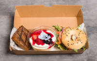 4 Mini filled savoury bagel, banana bread, seasonal berry & yoghurt cup Delivered cold | Individual box | Minimum 12 pieces