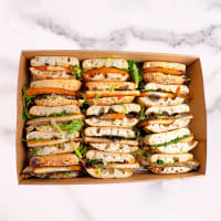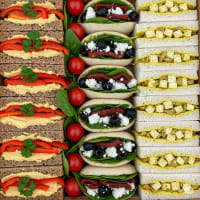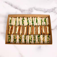 Delicate, flavorful, and entirely plant-based, our Vegan Finger Sandwich Platter is a perfect addition to any event, offering light and satisfying bites for your guests. Each sandwich is carefully crafted with fresh ingredients and served on a variety of soft, crustless breads. Platter includes: ● Sweet roasted red peppers layered with a smooth, savory hummus spread on whole meal bread. 7 ● Mediterranean Delight: Sun-dried tomato pesto, crumbled vegan feta, fresh spinach, and finely diced black olives. 7 ● Crumbled seasoned tofu mixed with vegan mayo, mild curry powder, sultanas, and chopped celery on white bread. 7