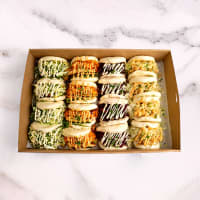 Platter includes: ● Double Chocolate – Chocolate cookie filled with rich chocolate ganache, topped with chocolate chips (Veg) ● Rose and Pistachio –Vanilla cookie filled with rose and pistachio cream,(Veg) ● Coffee Hazelnut – Espresso cookie with hazelnut praline filling, topped with roasted hazelnuts (N/Veg)