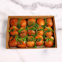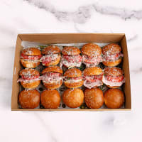 Includes: ● Duble smoked ham & Swiss cheese (4) ● Fresh Cheery Tomato and Burrata and basil(V) (4) ● Spicy Beef with Jalapeños, Pickled Onions & Garlic Aioli (4) ● Prawn Tempura with Wasabi Mayo & Pickled Ginge (4)