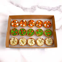 Includes: Choose one or more delicious flavours by setting a quantity of 18 and above. Options include: ● Mini Cupcake: Lemon & Lavender with honey buttercream (V) ● Mini Cupcake: Red Velvet with cream cheese frosting (V) ● Mini Cupcake: Chocolate & Raspberry with chocolate ganache (V) ● Mini Cupcake: Carrot Cake with spiced cream cheese frosting (V)