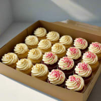 Includes: 20 cupcakes. A mix of: ● Lemon Cupcake with Vanilla Buttercream & Caramel (V) ● Chocolate Cupcake with Cream Cheese Frosting & Pink Sprinkles (V)