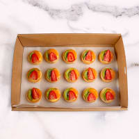 Our Signature Mini Fruit Tart Platter offers a refined assortment of bite-sized tarts topped with fresh, vibrant fruits. Ideal for corporate events. This Platter Includes 15 Mini Strawberry, kiwi and orange Tarts.