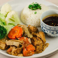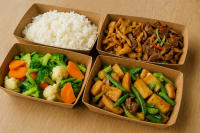 Broken rice, soy braise tofu with vegetable. Includes: • Tofu spring rolls (2 pieces) • Fruit Salad Bowl (Assortment of Asian Fruit)