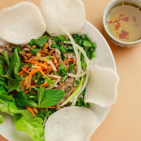 Vermicelli noodles, shredded pork, pork skin, lettuce served with seasoned fish sauce.