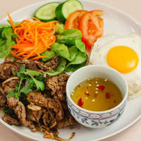 Lemongrass beef, broken rice, sunny side up egg, pickled carrots& daikon, lettuce, cucumber & tomato.