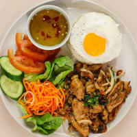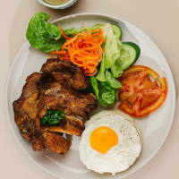 Signature BBQ pork chop, broken rice, sunny side up egg, pickled carrots & daikon, lettuce, cucumber & tomato.