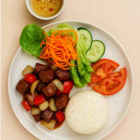 Broken rice, lemongrass beef, sunny side up egg, pickled vegetables, cucumber & tomato.Includes:• Chicken spring roll (2 pieces)• Fruit Salad Bowl (Assortment of Asian Fruit)