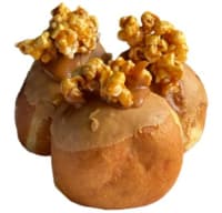 Fresh Donut filled with vanilla custard and caramel. Dipped in caramel truffle and topped with caramel popcorn. 8 per box.