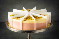 Ingredients: Almond meal, Whole egg, Egg yolks, White chocolate, Castor Sugar, Trimoline (Type of sugar), Cream, Water, Gelatine (halal), Raspberries, Pistachio, Vanilla bean, Canola oil, Glucose Fructose syrup, Potato starch, Rice Flour, and Salt