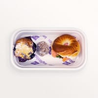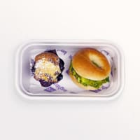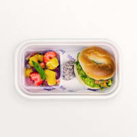 Smashed avocado mini bagel, fruit cup, protein ball.
