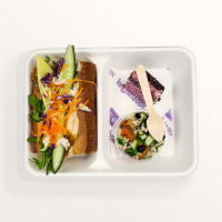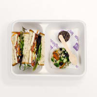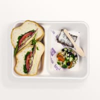 Baguette with seasonal greens and your choice of protein, brown rice salad pot & cherry ripe slice.