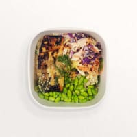 Grilled miso salmon fillet, w/ sweet sesame dressing served on a base of brown rice and rainbow slaw.