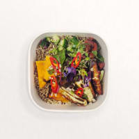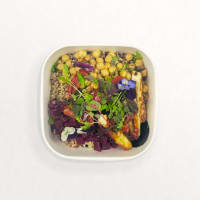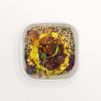 Maple miso tofu, edamame, radish, spring onion & avocado served on a base of brown rice and rainbow slaw.