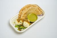 Our box of green goodness. Two soft boiled eggs with rocket topped with dukkah, with toasted flatbread and our famous green goddess dressing.