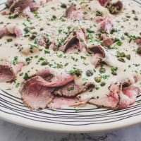 Ingredients: Thinly sliced slow cooked veal, anchovies, rustic egg and tuna sauce, caperberries. **Note: We require a minimum lead time of 4 business days.